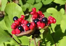 - Leaflets are broad ovate with a rounded to obtuse tip, hairless or sparsely villose or pilose, the petals are red, and the genome is diploid (2n=10).