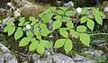 This plant has thick roots, that become narrower toward their tips. Its stems are hairless and have five to eight yellowish green to pink scales at its base. The compound pinnate leaves are arranged alternately around stout hairless stems. The blades of the lowest leaves may be in a horizontal plane or ascending, and are split into three. Those parts are themselves split into three leaflets. Each of these up to nine leaflets are inverted egg-shaped, 5—14 × 4–10 cm, with their downward facing surfaces either densely felted, roughly hairy or without hair, while the upward facing surfaces are always hairless. The foot of each leaflet gradually narrows into the leaflet stalk, has an entire margin, and a rounded or pointed tip.[1][4]