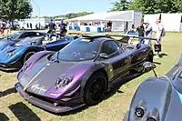The Zonda PS was a one-off special that was commissioned by Peter Saywell. It was finished in white with yellow striping on the side.[30] The car is the only one with all four exhaust pipes placed in a row instead of a square.[31] In January 2013 pictures surfaced of a redesigned Zonda PS. The PS has now been finished in bright blue and has the same rear-fin, air intakes, roof scoop and spoiler resembling the ones present on the 760RS and 760LH, but the exhaust pipes arranged in a row have now been replaced with the original layout. It also features the same day-time LEDs as on the Tricolore, 760LH and the 760RS. A unique feature present on the car is that its front arches are fitted with carbon-fibre fenders for improved down-force.[32] The car was involved in an accident in the UK in October 2017.[33]