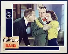Paid is a 1930 American pre-Code drama film[2][3] starring Joan Crawford, Robert Armstrong, and Kent Douglass in a story about a wrongly accused ex-convict who seeks revenge on those who sent her to prison using a scam called the "Heart Balm Racket".