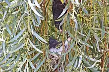 Height of nests in trees can vary from a couple of metres off the ground to over 15 metres high.[18] They are usually built in the drooping foliage of a eucalypt or other suitable tree species, or they are made within the structure of a mistletoe plant.[18]