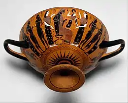 The Painter of Nicosia Olpe was an ancient Greek vase painter, who was producing work around 575 BC to 475 BC, and these dates are concluded from the vases that were found and attributed to the specific painter. All of the pieces are black-figure, and this can also be determined by the dates. The majority of vases that he painted were larger pieces; this is not something that he had control over, but he did have control over the scenes on the vases.[1]