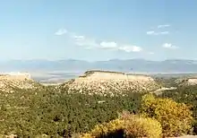 The Pajarito Plateau is a volcanic plateau in north central New Mexico, United States. The plateau, part of the Jemez Mountains, is bounded on the west by the Sierra de los Valles, the range forming the east rim of the Valles Caldera, and on the east by the Puye escarpment, which rises about 300 to 400 feet (90 to 100 m) above the Rio Grande valley about a mile (1.6 km) west of the river. The Rio Grande passes through White Rock Canyon to the southeast, and the Caja del Rio (Cerros del Rio) across the river is sometimes regarded as part of the plateau.[1] The plateau is occupied by several notable entities, including Bandelier National Monument, the town of Los Alamos and its remote suburb White Rock, and Los Alamos National Laboratory. Elevations range from about 5600 feet (1700 meters) at the river to about 7800 feet (2300 meters) where the plateau merges into the mountain range.