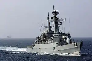 Since 2004, the Navy's deployment took place in Indian Ocean, playing a crucial role in the multinational NAVCENT in Bahrain, and took the leadership of the CTF-150 and CTF-151 as well as taking active participation in the Operation Enduring Freedom in 2006–10.[81][82][83] In 2008, the task force group consisting of PNS Badr, PNS Shah Jahan, PNS Nasr, and the Pakistan Air Force's Explosive Ordnance Disposal participated in the Exercise Inspired Union with the U.S. Navy in the Indian Ocean to develop skills in a prevention of seaborne terrorism.[84]