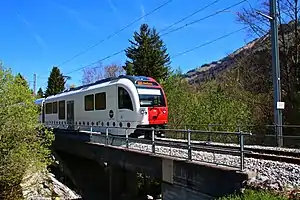 The Palézieux–Bulle–Montbovon railway line is a 1,000 mm (3 ft 3+38 in) metre gauge railway line in the canton of Fribourg, Switzerland. It runs 43.2 kilometres (26.8 mi) from Palézieux to Montbovon. The line is owned and operated by Transports publics Fribourgeois (TPF).
