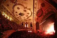 The balcony level extends over two-thirds of the sloping main floor. The heavily decorated ceilings and walls include pilasters rising to complex entablatures, statuary, and arches framing the wall boxes. A Czech made crystal chandelier hangs from the ceiling. The orchestra pit can be raised and lowered by an elevator.[3]