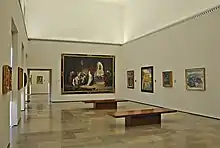 The Fine Arts Museum was moved here in 1958 and is housed on the palace's upper floor today. It displays a collection of paintings and sculptures from Granada dating from the 16th to 20th centuries. The bulk of the collection is drawn from the properties of the Catholic church, such as the Cartuja in Granada and other monasteries and convents. Among the highlights are The Burial of Christ by Jacopo Torni, Thistle Still-Life by Juan Sánchez Cotán, a Limoges enamel piece, and paintings by 20th-century artist Manuel Angeles Ortiz.[13]
