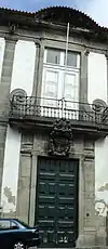 The three-storey, "L"-shaped building with its largest facade oriented to the south, and a small wing, towards the west, covered in tiled roof. The southern facade is symmetric and broken on the ground floor by seven sections, aligned on the first and second floors.[1] On the top floor, are seven windows, of which six are surmounted by broken frontispieces, while the central is much higher and flanked by curvilinear scribes.[1] The ground floor has three doors, with the central doorway surmounted by a granite coat-of-arms.[1] The narrow facade of the smaller corp, is oriented to the square, with the top and ground floors, towards the principal facade.[1]