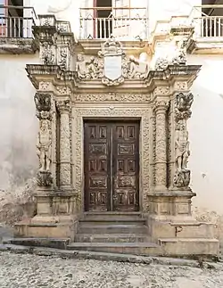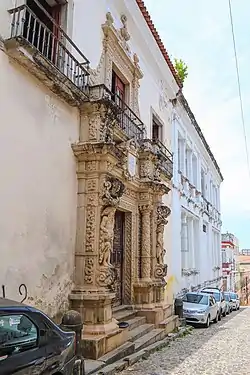 The Palace of Saldanha (Portuguese: Solar do Saldanha, or Paço do Saldanha), is former residence in Salvador, Bahia, Brazil. It is located in the Historic Center of Salvador and was constructed in the early 18th century. The residence has two stories with an attic and is typical of colonial architecture of the period: the ground floor housed slaves and servants; the second floor was reserved for the family of the owner. The façade has a monumental portal with ornate carved stone with solomonic columns with floral motifs and atlantes. Germain Bazin and others attribute the portal to Gabriel Ribeiro, designer of the ornate carved stone façade of the Church of the Third Order of Saint Francis (Igreja da Ordem Terceira de São Francisco), which it resembles. Ana Maria Lacerda calls the Palace of Saldanha an "icon of colonial architecture."[1][2][3][4]