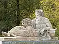 The palace is built on an artificial island that divides the lake into two parts, a smaller northern lake and a larger southern one. The palace is connected to the surrounding park by two Ionic colonnaded bridges. The façades are unified by an entablature carried by giant Corinthian pilasters that link its two floors and are crowned by a balustrade that bears statues of mythologic figures. The north façade is relieved by a central pedimented portico. On the south front, a deep central recess lies behind a screen of Corinthian columns.