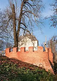 The Old Palace, also known as the Mostowski Palace, stands on the edge of the plateau overlooking the Vistula valley, where originally stood a former noble manor house. There used to be picnics at the end of hunting parties in this place, hence its second nickname, the Hunter's Palace. Fragments from the original mansion (17th century) are still preserved, like the stone wall strengthening the palace on the ravine side of the hill and the semicircular corner tower.[5] The two-story baroque mansion with Saxon Rococo elements was built in 1759-1766 by Paweł Michał Mostowski (1721-1766), general-lieutenant of the army of the Crown(1758) and Voivode (1758-1766) who took part to the Bar Confederation.[5]