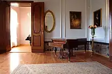 The square footprint brick building has three storeys with a mezzanine, an unused attic and an area of 712.5 square metres (7,669 sq ft).[4] In the basement, one can appreciate the stone barrel vault ceiling of the cellars.[6] The façades are adorned with columns, pilasters, stuccoed windows.[4] The northern elevation offers an observation deck with a vast view over the Italian garden reaching down to the Vistula valley. The front elevation displays a small stone balcony over the entrance and an apparent avant-corps framed by two pairs of pilasters, topped with a triangular pediment. The Mansard roof, covered with slate tiles, is crowned with an eagle sculpture. The interiors house fragments of stucco decorations and an openwork balustrade in the hall.[6] Since 2000, the palace has been hosting the Andrzej Szwalbe's collection of Historic Pianos.