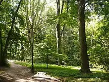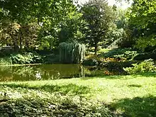 The English garden lies in the vicinity of the New Palace: it has been created in the 1830s by Peter Joseph Lenné, a renowned Prussian royal gardener, also co-author of the gardens of the Sanssouci Park in Potsdam.[2] It uses the natural assets of the terrain, consisting of a garden and a forest area. The layout features a large proportion of lawn clearings with picturesque terrain and trees.[4] The English garden backbone relies on monumental trees, relics of the Vistula oak-hornbeam forest, mainly little-leaf lindens and English oaks. These old trees map out on the one hand, the viewing perspective in front of the palace terrace and on the other hand, they contribute to the landscape together with lanes and ponds. It is complemented by a primeval forest set into the park. Clusters of oak-hornbeam dominate here, as well as enclaves of riparian woodland and alder carrs.[2] The park is additionally watered by its natural network that runs throughout the entire complex: a stream and four ponds called Kluczyki,[4] encircled by lawns, shrubs, perennials and aquatic plants.[8]