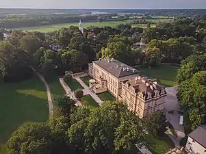 The New Palace is located in the eastern part of the park, facing the main entrance to the Palace and Park ensemble. It boasts neoclassical features, with eclectic extensions. The main body is rectangular, with a slight avant-corps at the front and a rear façade closed by a terrace.[6] The palace is two storey high with a basement, its gable has a low hip roof. From the south has been added a neo-baroque, two-level hunting mansion with a mansard roof chapel, connected to the palace with a two-story gallery. On the northern side of the New Palace one can find the ballroom.[4]