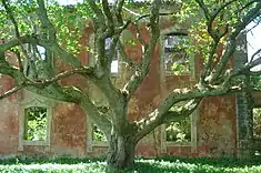 The residence is a two-storey building, in a L plan with only its walls still standing, covered in ornate late-Baroque frame windows.[5] These walls are constructed of plastered stone masonry and painted in reddish pigment. To the rear of the main building is a more recent kitchen annex that runs parallel to the principal body that defines a servant's courtyard.[5] This space is delimited by a wall, and partially, by the two cisterns with vaulted ceilings.[5] In several locations, including on the eastern wall of the cistern and western wall of the building are decorated "fountains" plastered with shells.[5]