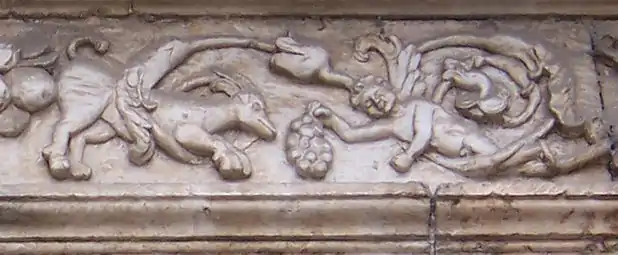 In the spandrels of the arch of entrance there is two ornamental figurines representing children or sand devils that hold some fruits. It has wanted to relate to these figures with an allegory of the love.[7]