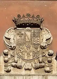 The current coat of arms, which can see in the center of the pediment split of the palace, corresponds to the grandson of Fabio Nelli, Baltasar de Rivadeneira y Zúñiga. Also it belongs to this character the shield that still exists in the Boecillo village (current Vega de Porras), that was country house, property of the banker.[nota 6] However, in this same site of the frontage was in his day the pertaining shield to own Fabio Nelli which have exact news thanks to the description written that made, dated on 20 June 1608.[9]