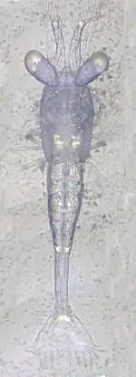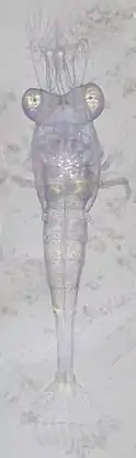 After hatching a Palaemonetes kadiakensis will go through six distinct larval stages before reaching its final adult form.[4] Among larvae reared in experiments, the duration of larval life was 16 to 24 days and the average length of larval life was 19.64 days.[4] In laboratory settings the larvae are fed Artemia salina Nauplius[3] or 100-500 micron sized commercial feed.