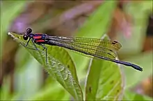 Males of the species are almost completely dark, with two striking red stripes on the breast and red spots between the eyes. The lower abdomen appendages are hook-shaped.[3][4][5]