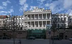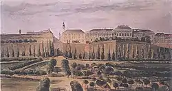 Palais Coburg was designed in 1839 by architect Karl Schleps in Neoclassical style, and built from 1840 to 1845 by Prince Ferdinand of Saxe-Coburg and Gotha atop the Braunbastei (Brown Bastion), a part of the Vienna city defences dating to 1555. It is nicknamed the Spargelburg ("castle of asparagus") for its central portico with many freestanding columns.