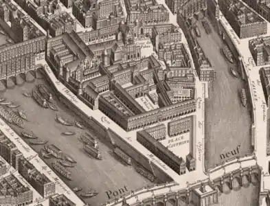 At the west end of the island, where Place Dauphine is today, was a walled private garden, a bath house where the King could bathe in the water of the river, and a dock, from which the king could travel by boat to his other residences, the Louvre fortress on the right bank and the Tour de Nesle on the left bank.[6]
