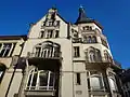 The main entrance to the Palais is on rue Sellénick, a street created in 1888 (original name: Julianstraße).[26] The entrance to the rear wing is on boulevard Clémenceau, a street created in 1881 (original name: Steinring).[27] The whole complex takes up half of the square block delimited (clockwise) by boulevard Clémenceau, rue Specklin, rue Sellénick, and rue de Phalsbourg. It does not, however, stand out in height from its immediate surroundings. The only conspicuous element is the octagonal tower at the corner of rues Sellénick and de Phalsbourg, structurally (but not stylistically) close to the tower of the Mulhouse courthouse (French: tribunal d'instance) designed by the same two architects and inaugurated in 1902.[28]