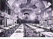 The Palais des Fêtes was built as the Sängerhaus (singer's house) between 1901 and 1903, when Strasbourg was a German city and the capital of Alsace-Lorraine. It was one of the first buildings in Strasbourg to make use of reinforced concrete. Although the architects Joseph Müller (1863–??) and Richard Kuder (1852–1912) chose an Art Nouveau style for the building, the main auditorium − surface: 800 m2 (8,600 sq ft) [or 850 m2 (9,100 sq ft) according to other sources], height: 14 m (46 ft), seating capacity: 1,300[9][10] – was decorated in a lavish Neo-Baroque style. The building also included a restaurant large enough to accommodate up to 300 guests. The inauguration concert took place on 31 January 1903. In 1904, the premises were already considered too small and a new story was added on the current rue de Phalsbourg, including a rehearsal room now called Salle Balanchine.[11] A pipe organ was installed in the main hall in 1909. A work by builders Dalstein & Hærpfer, it was designed, like several other pipe organs in Strasbourg (for instance the choir pipe organ of Saint-Thomas church), according to principles by Albert Schweitzer.[12]
