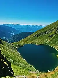 Situated at the bottom of a grassy hollow, enclosed by high rock walls, the lake is a deep basin of rather large dimensions. The latter is further accentuated by the steepness of the depression.[23]