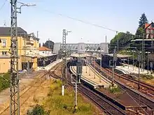 After the outbreak of World War II on 1 September 1939, the line was again used by numerous military transports; as early as 1938 deportations to Dachau had taken place in Kaiserslautern and Ludwigshafen.[37] From 1943 onwards the line was regularly exposed to bombardment, initially the railway lines in Saarbrücken and Ludwigshafen were affected. This was followed by the bombing of Kaiserslautern and Homburg in 1944 and St. Ingbert towards the end of the year. As a result, railway installations were considerably affected. The entrance building of Kaiserslautern Hauptbahnhof was, for example, almost completely destroyed on 28 September and 18 December. The same was true for Hauptbahnhof Homburg. Lambrecht (Pfalz) station was destroyed by fire in March 1945 during combat operations.[40][41]