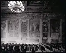 The palace is directly linked to the famous Giant's Hall, where conventions and concerts are currently held. This salon, which is accessed via a staircase next to the current Liviano Palace, has its name for its frescoes that represent heroes and great characters of antiquity in size. The theme of the frescoes, which dates back to the early '500, resembles that of previous frescoes decorating a room now lost in the ancient Carrara Palace. The original frescoes were inspired by a work by Petrarca, then guest of the Padova lords.[4]