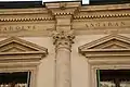 The spaces between the columns are occupied by three windows with an overhanging balcony, each surmounted by a triangular pediment in strong projection. Intended to illuminate the barn, three windows cut into the frame architrave, and closed in 1825, occupied the upper end. The facade is also animated by a play of light and shadow, through articulation in several layers of depth obtained by the use of columns, molding and balcony windows and gables. The socket base is coated with a rustication. The architect breaks the relative monotony of the bosses texture with the arch of the entrance lobby, and especially with the trapezoidal grounds that surround the two side openings below.