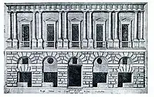 This rustication technique was quickly adopted in Rome, and the building, which had been inspired by Roman architecture, was soon imitated (for example, at Palazzo Massimo alle Colonne, erected in 1532 by Baldassare Peruzzi).[16] However, the palace was soon subject to decay.[17] In a 1581 drawing, the rustication coating at the ground floor had disappeared, and after 1585, the two facades assumed a pronounced manierist look.[17]