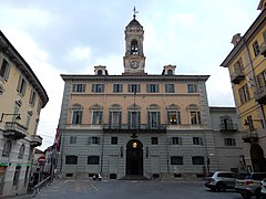 The site where now stands the Palazzo di Città was previously occupied by the De Burgo Hospital, abandoned by 1750. The building of a new seat for the Comunal Council was then ordained on the 14 March 1741, having the previous one being judged as inadequate. The project of the building was presumably commissioned to engineer and architect Pietro Felice Bruschetti, even though some other sources point the engineer Giovanni Battista Borra as responsible for the planning of the building. Construction works started on 3 July 1758 and ended in 1761.[1] Between January and December 2013 the Palazzo experienced a renewal of its main façade and of its grand hall.[2]
