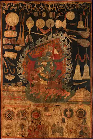 Palden Lhamo appears in the retinue of the Obstacle-Removing Mahākāla, either as an independent figure[1] or associated to Ekajati,[7] and has been described as "the tutelary deity of Tibet and its government",[8] and as "celebrated all over Tibet and Mongolia, and the potent protector of the Dalai and Panchen Lamas and Lhasa."[9]