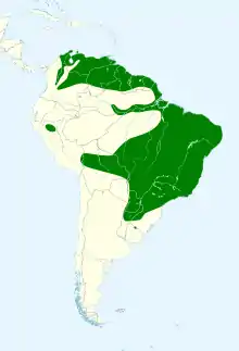 It is found in a wide range of wooded habitats in eastern and northern South America, from Brazil, Colombia to Uruguay,[2] with localized population in the west.