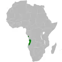 It is found in western Angola, Gabon, southern Congo and extreme western Democratic Republic of the Congo. Its natural habitats are subtropical or tropical dry forests, subtropical or tropical moist lowland forests, and moist savanna.