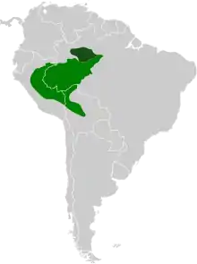 It has two subspecies: The widespread nominate has a white rump and is found south of the Amazon River and west of the Madeira River, while ochroptera has a yellowish rump and is found between the Amazon River and the lower Rio Negro. Genetic evidence suggests the closest relative of ochroptera is the grey-winged trumpeter, leading some to treat it as a separate species, the ochre-winged trumpeter (P. ochroptera).[2]