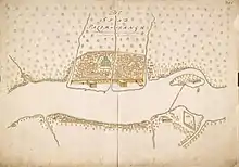 The Kraton of Kuto Gawang was sketched by Joan van der Laen in 1659. The sketch shows a fortified city facing the Musi River with the Rengas River running through the middle part of the city from north to south. The Taligawe River is located to the east of Kuto Gawang, while to the west is Buah River. In the middle of Kuto Gawang is a structure, possibly a mosque, located to the west of Rengas River. The Kraton was described to also had three stone bastions. Foreigners (e.g. the Chinese and Portuguese) were known to settle on the banks of the Musi River opposite of the Kraton, to the west of the mouth of Komering River.[4]