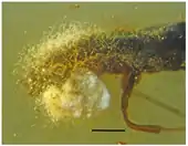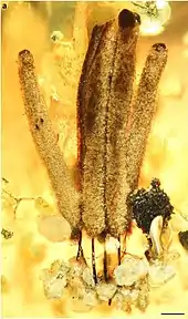 Burmese amber is fossil resin dating to the early Late Cretaceous Cenomanian age recovered from deposits in the Hukawng Valley of northern Myanmar. It is known for being one of the most diverse Cretaceous age amber paleobiotas, containing rich arthropod fossils, along with uncommon vertebrate fossils and even rare marine inclusions. A mostly complete list of all taxa described up until 2018 can be found in Ross 2018;[1] its supplement Ross 2019b covers most of 2019.[2]