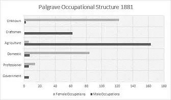 However, there is a significant amount of the population of Palgrave that has an unknown occupation, accounting for 17.4% of the total population (124 people) in 1881.[6] This unknown occupational data would make it difficult to establish the overall class of the Palgrave, however it could be understood that the local society around 1881 was of a lower, working class, due to the large proportion of occupations being in labour roles such as agriculture, domestic and craftsmanship.