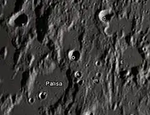 By convention these features are identified on lunar maps by placing the letter on the side of the crater midpoint that is closest to Palisa.