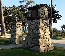 Craftsman-style masonry gates of granite field stone and brick, with 2-foot by 2-foot Batchelder tile insets - Statue of Santa Monica (1934) by Eugene H. Monrahan (terminus of Wilshire Boulevard)
