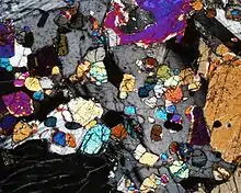 The composition of the sill is that of diabase, although its mineral assemblage is not uniform throughout the thickness of the body. The mineralogy of the sill consists principally of plagioclase feldspar, several varieties of pyroxenes, and olivine, with minor biotite, titanite, zircon and oxides.