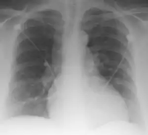 Palla's sign is a clinical sign in which an enlarged right descending pulmonary artery is seen on the chest x-ray in patients with pulmonary embolism. It is of low sensitivity, and its specificity is not known. It exhibits as a "sausage" appearance on X-ray. [1] It is named after italian radiologist Antonio Palla. In 1983, he published his observations that close to 25% of patients with pulmonary embolism had a chest x-ray sign of enlarged right descending pulmonary artery.[2][3]