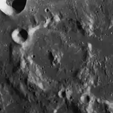 Pallas is a heavily eroded lunar impact crater located to the north of the Sinus Medii. It was named after the German-born Russian natural historian Peter Simon Pallas.[1] To the northwest is the smaller but less worn crater Bode. Pallas shares a low wall with the crater Murchison that is attached to the southeast, and there are two gaps in the shared rim.