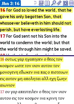 ![]() On the top half of the screen, John 3:16 in the King James Version is shown; the same verse is also shown in the Textus Receptus (Greek) at the bottom. John 3:16 is highlighted in yellow because it is bookmarked | |