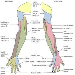 ![]() Diagram of segmental distribution of the cutaneous nerves of the right upper extremity. (Ulnar palmar labeled at bottom left, in blue.) | |