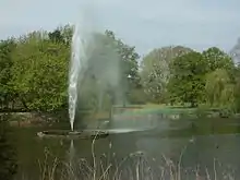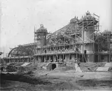 The Palmengarten was opened on 29 April 1899 with a ceremony led by mayor Otto Georgi. As "Leipzig's most distinguished recreation centre", it was reserved only for the "upper-class circles".[2] The assembly rooms designed by the architects Schmidt and Johlige were eponymous with the park and the main tourist attraction. They are located in the northeastern part of the park. The Palmenhaus, located south of the assembly rooms, covers an interior surface of 1.280 m² with palm trees and a variety of tropical flora. A pond with a surface area of 11.050 m² is located southeast of the old assembly rooms. A bridge connects the island in the northern part of the lake to the park's main path. A cast-iron pavilion built in 1897 is located on the eastern bank of the lake. During the Saxon-Thuringian industry and trade exhibition, the pavilion was located near the König Albert Park.[3]