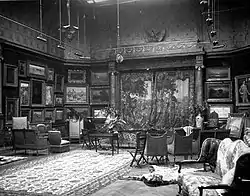 The mansion featured a three-story Italianate central hall under a glass dome.[9] Other rooms were finished in a variety of historic styles: a Louis XVI salon, an Indian room, an Ottoman parlor, a Renaissance library, a Spanish music room, an English dining room that could seat fifty, and a Moorish room, the rugs of which were saturated with perfumes.[6][9] A collection of paintings, collected by Bertha Palmer, adorned the mansion's grand ballroom, 75-foot (22.9 m) long. The room's murals in the frieze above them were by Gabriel Ferrier.