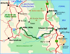 The Palmerston Highway (State Route 25), serves as a link between the southern part of the Atherton Tablelands and the Far North Queensland coastal strip, in Australia.[1] Starting just north of Innisfail, from the Bruce Highway it winds through the Wooroonooran National Park to the township of Millaa Millaa, with no major road junctions. It terminates at an intersection with Old Palmerston Highway and Main Street. Its total length is 54.6 kilometres.[2] From here State Route 25 continues west and then north as Malanda-Millaa Millaa Road, while Old Palmerston Highway (East Evelyn Road - State Route 24) continues south and then west as a Tourist Drive (not suitable for caravans) to where it meets the Kennedy Highway north of Ravenshoe.